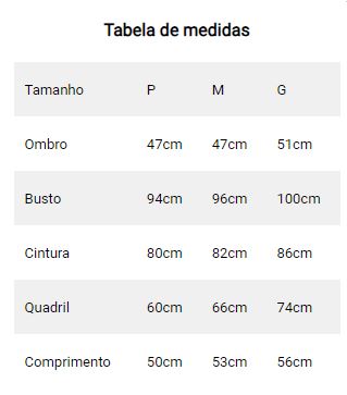 *Tabela de medidas em cm no final dessa página;